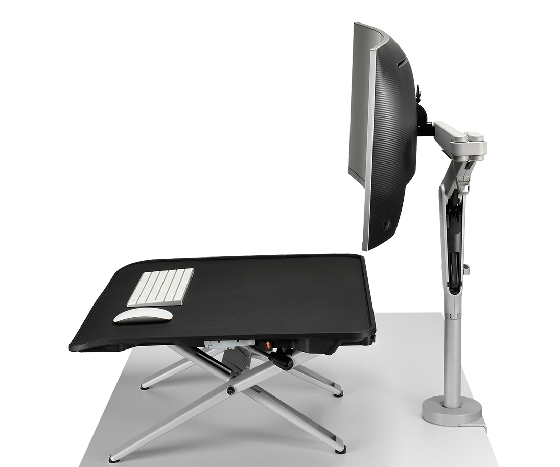Monto permet de travailler assis ou debout devant tout bureau, où que vous soyez. Ce dispositif portatif peut être installé sur tout poste de travail déjà établi. Utilisé avec un bras de moniteur dynamique ou un support pour ordinateur portable de CBS, Monto transforme sans effort un bureau fixe en poste de travail réglable en hauteur, adapté aussi bien au travail debout qu’assis.
